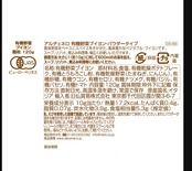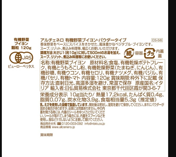 食塩、有機乾燥ポテトフレーク、有機とうもろこし粉、有機乾燥野菜(たまねぎ、にんじん)、有機砂糖、有機コーン、有機セロリ、有機サツマイモ、有機パセリ、有機トマト