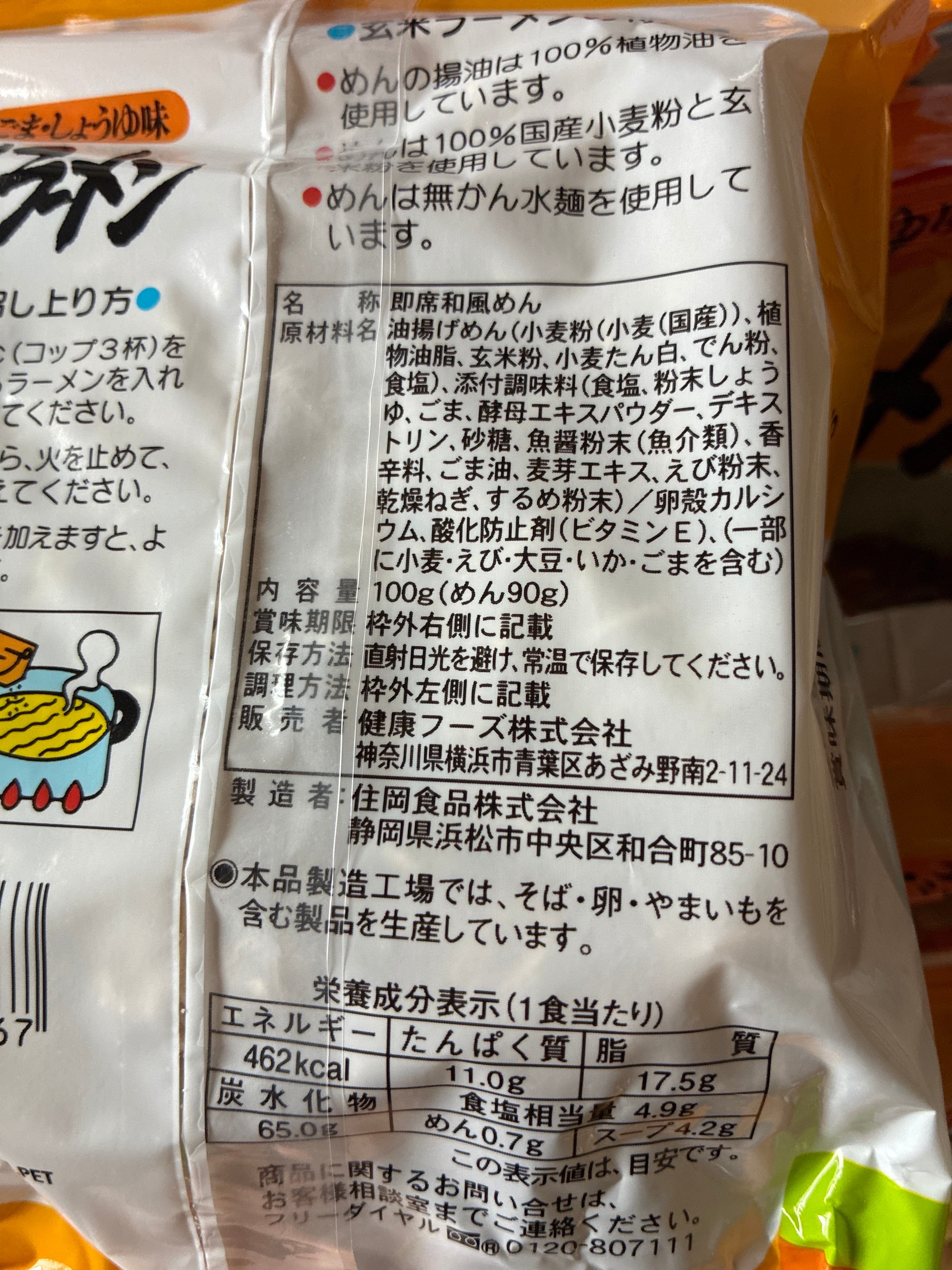 原材料名 油揚げめん〔小麦粉(国産)、植物油脂、玄米粉、小麦たん白、でん粉、食塩〕、添付調味料〔食塩、粉末しょうゆ、ごま、酵母エキスパウダー、デキストリン、砂糖、魚醤粉末(魚介類)、香辛料、ごま油、麦芽エキス、えび粉末、乾燥ねぎ、するめ粉末〕/卵殻カルシウム、酸化防止剤(ビタミンE)