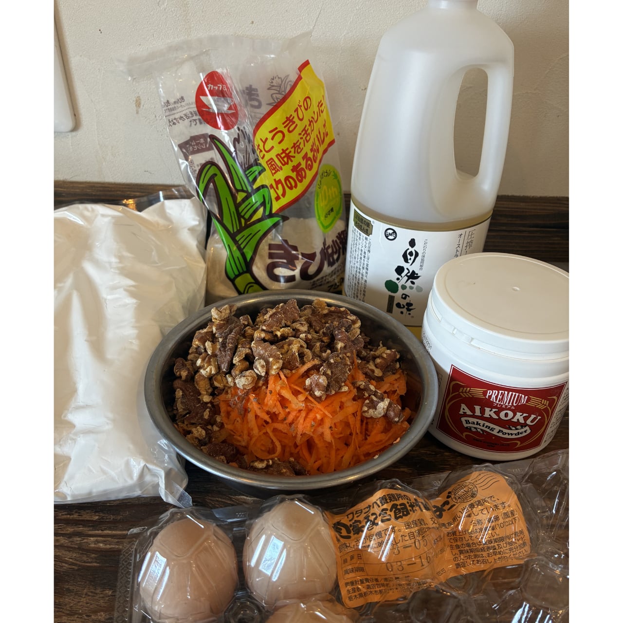 《生地》大田原産米粉、菜種油、きび砂糖、農薬、人参(化学肥料・農薬不使用)、くるみ、卵、シナモン、重曹/ベーキングパウダー